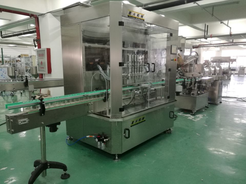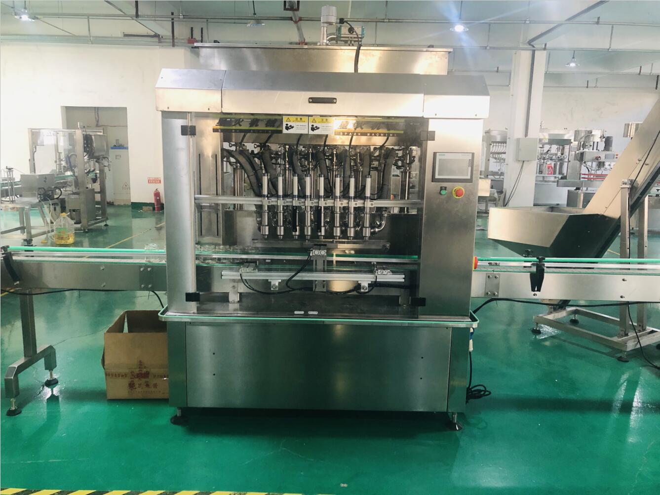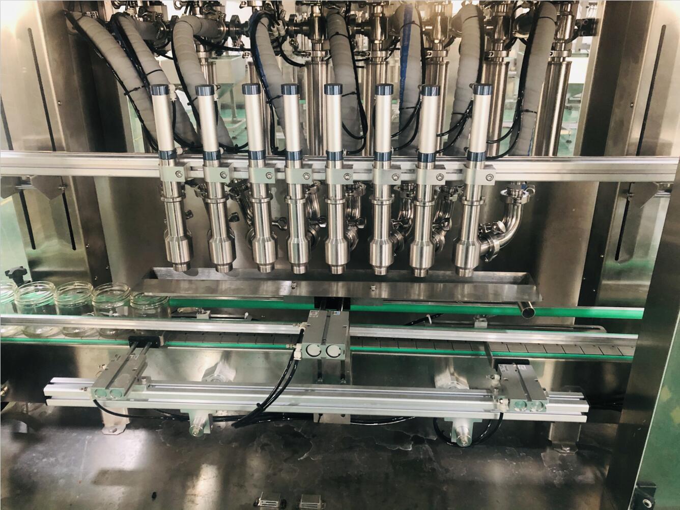 該機為8頭伺服式醬料灌裝機,星火公司自主研發,擁有技術及外觀專利證書,是我司針對醬料等粘稠產品的包裝、灌裝設計的一種新型包裝機設備,結構合理穩定,不易損壞,工作性能好,氣動部分均采用德國FESTO和日本SMC的氣動元件;氣缸的活塞和缸體均由聚四氟乙烯和316L不銹鋼材料制成,符合GMP要求;灌裝量和灌裝速度均可任意調節,精度高;灌裝悶頭采用防滴漏、防拉絲灌裝裝置,是豆豉醬、辣椒醬、辣椒醬等顆粒醬料灌裝的很佳灌裝生產線。